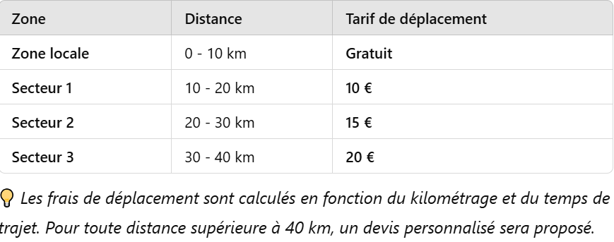 Pour finir, les frais de déplacement sont offerts jusqu’à 10kms, puis sont facturés sous forme de forfait organisé par secteur géographique (au départ de Pleslin- Trigavou)